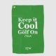 Keep your head cool in style with this playful golf-themed towel! Featuring the fun text "Keep it Cool and Golf On" alongside a whimsical graphic of a bouncing golf ball, this towel is perfect for any golf enthusiast. Ideal for holidays, birthdays, retirements, or any special occasion, this towel makes a perfect gift.