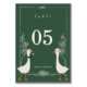 Add a touch of charm and humor to your celebration with this whimsical goose table number sign, featuring an adorable pair of geese dressed for the occasion—one with a bow tie and the other with a floral hat. Set against a rich green background with delicate vintage-style line art, this design perfectly blends elegance with playful personality.