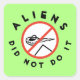 This sticker has a prohibitory traffic sign with a cartoonish flying saucer and a stylized pyramid on a white background, crossed by a red "forbidden" line. The sentence "aliens did not do it" in capital black letters runs all around the sign on a light green background.