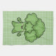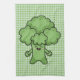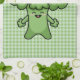 Cute green cartoon broccoli with an adorable happy face. The background is a green and white gingham pattern.