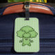 Cute green cartoon broccoli with an adorable happy face. The background is a green and white gingham pattern.