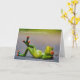 A funny green frog with bright orange eyes lies on his back on the front of this birthday card. The light gray text above him says "Contemplating your birthday..." The inside says "...and wondering just how many candles we can get on that cake, anyway." Below, in smaller print is the text "Have a happy one!" All of the text can be easily customized, so you may make it say whatever you'd like. Cute!