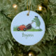 Funny green frog mowing lawn cartoon ceramic ornament