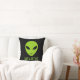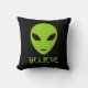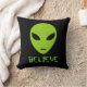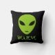 Funny green space alien head black throw pillow. Cute home decor with extraterrestrial life form. Big black eyes. Personalized with name or fun quote like .. Believe Trendy cushions for sofa, couch or bed in bedroom. Cool decorations for boys or girls room, dorm room, play room, nursery etc. Suitable for men women and kids.