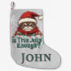 Add a touch of holiday humor to your fireplace with this funny grumpy cat Christmas stocking by Kaliverse Creations! Featuring a festive yet unimpressed cat tangled in Christmas lights with the phrase "Is This Jolly Enough?", this stocking is perfect for those who enjoy a bit of sarcasm during the holidays. Personalize it with a name to make it a unique gift or a hilarious addition to your holiday decor that friends and family will love.