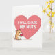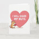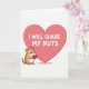 This greeting card features a simple white background with a large soft pink heart taking up the right side. Inside that big heart, the text reads “I WILL SHARE MY NUTS” in all-caps white block letters, centered and easy to spot. On the left, there’s a small cartoon hamster in warm tan and cream colors with dark eyes, rosy cheeks, and a sweet little smile. The hamster holds a smaller deep red heart in its tiny paws, as if offering it to someone special. A light shadow under the big heart adds a bit of depth, but the overall look stays simple and graphic. The message feels funny and affectionate at the same time, making it great for a close partner or a friend who enjoys a cheeky joke ❤️💌🍫.