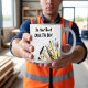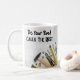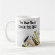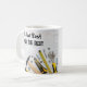 Funny men's coffee mugs with a handyman construction humor theme and cliche along with hand tools in the background.