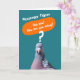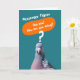 This is a fun card to say a quick hi to an old friend. The design features a close up, color, photographic image of a pigeon set against a dark jade background. The text above the pigeon reads: 'Messenger Pigeon' in white, against the jade background. 'Hey you! How are you doing?' in white on an orange, uneven oval shaped text box. And question mark in white above the pigeon's head. The inside text reads: 'I just thought I'd flutter by to say hi' but this can be edited, during the ordering process, according to your own preference. A fun and simple card.