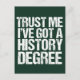 Trust Me I've Got a History Degree. A humor gift for a historian after they graduate college or university. Funny quote on a cute green postcard.