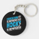 Funny hockey themed keychain with blue and white text on a black background reads Education is Important But Hockey is Importanter!
