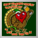 This cynical, drunk turkey with a heart head and a green Santa hat is saying, "Happy Thanksgivi- Christma- Valentine's Day on Whatever Year This Is!" while waving a bottle and glass of champagne. If you're looking for one humorous poster that you can display for Thanksgiving, Christmas, New Year's and Valentine's Day -- that features a freakish, mutant heavily-drinking cartoon creature -- this is the one for you. It covers all four holidays, so no need to worry about taking it down. Also available on other items in the "Thanksgiving" section of our store.