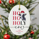 Funny christmas ornament featuring a watercolor farm cow wearing a xmas hat, the saying 'ho, ho, holy cow', your family name, and the year.
