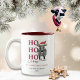 Funny Holy Cow Christmas Mug. A cute farm-themed design featuring a cow wearing a jolly Santa hat and saying "ho ho holy cow it's Christmas again" on a white background. Enjoy your Christmas coffee or hot chocolate with this farm-themed, festive mug. It also makes a great holiday gift for your family and friends.