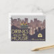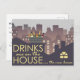 Creative cartoon style invitation design for a housewarming party to celebrate someones new home. Drinks tub with bottles is shown on top of the house. Please personalize text.