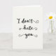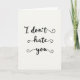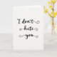 This card keeps things simple with the words “I don’t hate you” as the main focus. The message is written in three centered lines in deep black ink. The letters are smooth and flowing, with gentle curves and a few longer strokes that make the first “I” and the word “you” stand out. Everything sits on a warm off-white background that feels calm and quiet. There are no characters or extra objects, so your eyes go straight to the message and what it might mean. The overall mood feels like a pause after tension, like reaching out with honesty and a small bit of care 💘. It’s an unusual but real kind of Valentine message that can fit friendship or a complicated romance ❤️.
