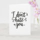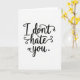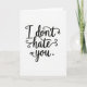 This card features a simple white background with the words “I don’t hate you.” placed right in the center. The text is written in black with a flowing, cursive look, and the letters have a few gentle curls at the ends. The lines shift from thicker strokes to thinner ones, making it feel like it was written with care instead of typed. There are no characters or extra objects, just lots of open space around the message so your eyes go straight to the words. The phrase comes across as honest and a little shy, like someone trying to say something kind without making a big scene. It’s a funny-sweet way to show affection or friendly love on Valentine’s Day 💘❤️. Share it with someone who will get the joke and feel the warmth behind it. Wishing you an easy, loving Valentine’s Day—pass along a little affection to someone you care about 😘.