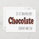 This funny postcard will keep them smiling with it's unique design. The words say, "If it involves Chocolate I'm in".