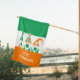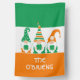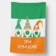 Funny personalized house flag featuring three cute Irish gnomes clad in orange, green and shamrocks. Add your name or other text in green Celtic-style typography.
