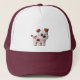 Image cute cartoon puppy with brown spots on white and burgundy trucker hat, minimalist dog design cap.
