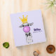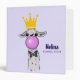 Personalized binder with a whimsical llama blowing a pink bubble while chewing gum. Wearing a gold crown and a black bow tie. Light purple background.