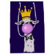 A gift bag with a whimsical llama blowing a pink bubble while chewing gum. Wearing a gold crown and a black bow tie. Dark purple background.