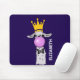 A mousepad with a whimsical llama blowing a big pink bubble. Wearing a gold crown and a black bow tie. Dark purple background.