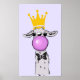 A poster with a whimsical llama blowing a pink bubble while chewing gum. Wearing a gold crown and a black bow tie. Light purple background.