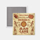 Create your own humorous, custom "man cave" fridge magnet using this easy DIY template. Made to look like the wall of a cave, the square magnet has primitive drawings of men throwing darts, a dart board, a TV, a football, two baseball bats, two baseballs, two pretzels and a couple retro beer bottles. The refrigerator magnet can be easily personalized with your name and the year your home bar or "man cave" hideout was established. The whole design is in shades of brown, yellow and a little red.