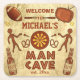 Create your own humorous, custom "man cave" pulpboard paper coaster set using this template. Made to look like the wall of a cave, the coasters have primitive drawings of men throwing darts, a dart board, a TV, a football, two baseball bats, two baseballs, two pretzels and a couple of retro beer bottles. The coasters can be easily personalized with your name and the year your home bar or "man cave" hideout was established. "Welcome" and "to" are also changeable if you'd like - but the "Man Cave" words are part of the design. The whole coaster is in shades of brown, yellow and a little red. "Customize It" to make more changes, such as resizing text. These are the ultimate, funny man cave coasters for your male sanctuary!
