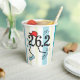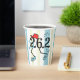 Cute, funny, colorful running 26.2 marathoner character © with a red cap and blue shoes! Funny Marathon Sports themed for the long distance twenty-six point two mile runner! Funny Marathon Cups for people who run long distances or running instructors or coaches. The Background is a Blue and Yellow Striped Pattern to highlight the Sports Figure.
