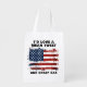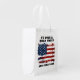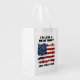 This humorous grocery bag features American Flag and customizable text "I'd Love a Mean Tweet and Cheap Gas".