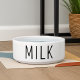 This minimalist dog bowl for water features the word "milk" in a trendy black text on a clean white ceramic base. Designed for modern dog lovers, it blends style and humor in a sleek, functional piece. Perfect for dogs with a foodie attitude and pet parents who love trending, understated accessories. A matching food bowl with "cookies" text is available separately to complete the look.