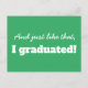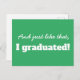 A funny minimal typography design in green and white with a cool text pairing that says: And just like that, I graduated! with a text template on the back for you to add your custom text in matching green and white colors inverted. #thankyou