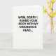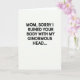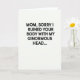 This greeting card features a stark white background with a single line of bold, black sans-serif text centered on the front. The message reads, “MOM, SORRY I RUINED YOUR BODY WITH MY GINORMOUS HEAD…” and it’s laid out as the main focus with lots of open space around it. That roomy spacing makes the words feel like a candid note left on a kitchen counter, where family jokes land with a soft, affectionate sting ❤️. The all-caps wording gives it an upfront, teasing tone, like someone grinning while they admit they were a handful. The extra emphasis on “GINORMOUS” leans into the exaggeration, turning the apology into a shared laugh between parent and child. The trailing ellipsis adds a pause that feels like a sheepish glance and a half-hug, keeping the humor tender rather than harsh 🌼. The text stays centrally aligned in solid black against the plain white field, with no other graphics or borders.