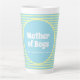 Funny latte mug for Mother's Day or any day to honor special moms! Blue and yellow pastel striped background with white text that reads "Mother of boys. There may be wine in here"