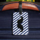 FUNNY MUSTACHE LUGGAGE TAG. BLACK MUSTACHE WITH BLUE AND WHITE STRIPES PATTERN. "I MUSTACHE YOU TO RETURN MY LUGGAGE". MOVIEFUN© For other colours of mustache or background stripes pattern please contact store.