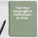 The perfect sassy notebook for one of 'those' days...or weeks. With a pretty sage green background, the modern bold white typography reads "I don't have enough coffee or middle fingers for today".
