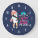A clock with a humorous saying: First i drink the coffee, then I save the lives. Perfect for nurses. Featuring an illustration of a female nurse wearing a cute old fashioned nursing hat and carrying a giant hypodermic needle. Dark blue background.