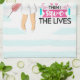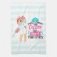 A kitchen towel with a humorous saying: First i drink the coffee, then I save the lives. Perfect for nurses. Featuring an illustration of a female nurse wearing a cute old fashioned nursing hat and carrying a giant hypodermic needle. Background has a light blue and white striped pattern.