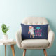 A lumbar pillow with a humorous saying: First i drink the coffee, then I save the lives. Perfect for nurses. Featuring an illustration of a female nurse wearing a cute old fashioned nursing hat and carrying a giant hypodermic needle. Dark blue background.