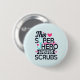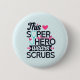 A button with a cute and comical saying. Typography text says: This superhero wears scrubs. Designed with a light blue stethescope and a big pink heart and a pink heart monitor line. A light blue background with faded pink polka dots.