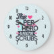 A clock with a cute and comical saying. Typography text says: This superhero wears scrubs. Designed with a light blue stethescope and a big pink heart and a pink heart monitor line. A light blue background with faded pink polka dots.