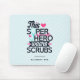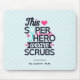 A mousepad with a cute and comical saying. Typography text says: This superhero wears scrubs. Designed with a light blue stethescope and a big pink heart and a pink heart monitor line. A light blue background with faded pink polka dots.