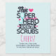 Nursing / Cavegiver thank you bottle labels with a cute and comical saying. Typography text says: This superhero wears scrubs. Designed with a light blue stethescope and a big pink heart and a pink heart monitor line. Text says: Cheers! Thank you for your compassion and dedication to helping those in need.