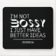 This mousepad is perfect for all the ambitious women out there. If you're the type of person who's always bursting with great ideas, then you need this mousepad on your desk. It boldly declares, "I'm not bossy I just have better ideas," setting the tone for your workday. It also makes for a perfect gift for your friend or colleague who has the same take-charge attitude. It's sure to bring a smile to their face and a sense of humor to their workspace. Whether you work in an office or from home, this funny mousepad is an excellent way to showcase your confidence and let everyone know who's in charge.