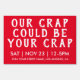 Funny yard sale sign featuring a red background that can be changed to any color, the words "our crap could be your crap", the day/date/time, and your address.