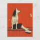 All rights reserved © Angelandspot a funny part dog part human posing for a portrait wearing a black mini skirt and white tennis shoes with a red background