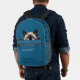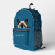 This cute backpack has the image of an Siamese cat with blue eyes peeking out. There are black paw prints all over the blue sides and top of the bag. The pocket below has text in silver. You can change the text to personalize the bag, or say anything else you'd like better.