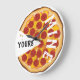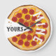 This fun clock features a pepperoni pizza with a piece cut out. The pizza side says "MINE" and where the missing slice was it says "Yours". You can personalize it or remove the words and just have a pizza clock.