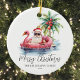Get into the holiday spirit with this unique Christmas ornament featuring a relaxed Santa Claus in sunglasses lounging in a pink flamingo floaty in the ocean. Perfect for adding a beachy vibe to your Christmas tree, this ornament is ideal for those who live in tropical places like Florida, Hawaii, or the Bahamas, or for anyone who loves a fun, coastal holiday theme. The scene includes a palm tree decorated with ornaments, gentle ocean waves, and a small island behind Santa, all captured in a charming rustic watercolor style. The mix of simple fonts and script typography adds a casual yet elegant feel, while the date is displayed at the bottom to mark the occasion. A fun and festive way to bring some surf and sand into your holiday décor! Funny Beach Christmas Ceramic Ornament With Summer Santa In A Flamingo Floaty Palm Tree Ocean